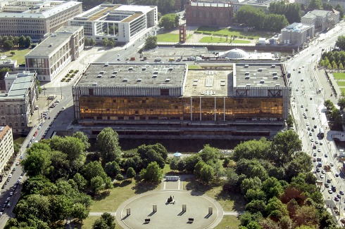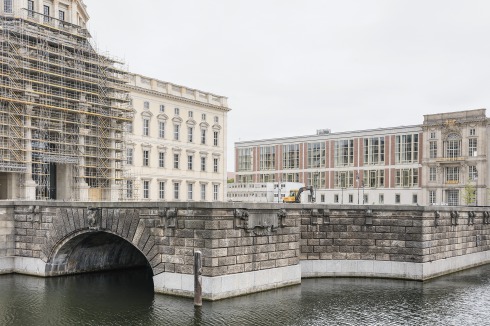 Wer erinnert sich noch an jenes vorwurfsvolle Gejammer, mit dem Anfang der neunziger Jahre der Abriss des DDR-Außenministeriums an der westlichen Kante der Spreeinsel begründet wurde: Der blau-weiße Riegel (145 Meter lang, 44 Meter hoch) würde sich als störende Barriere zwischen das mittelalterliche Cölln-Berlin und die mondänen Quartiere der Kaiserstadt schieben! Jetzt ist die Barriere hundert Meter weiter ans Ostufer gerückt, nicht mehr ganz so hoch, dafür um ein Vielfaches brachialer. Im Gegensatz zu Joseph Kaisers feingliederigem Linienspiel aus den 1960er Jahren möchte man das, was da jetzt über dem versteinten Spreeufer dräut, „Architektur“ nicht wirklich nennen.