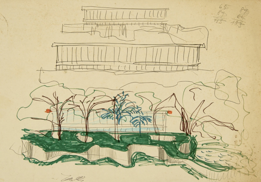 1965: Museu de Arte de São Paulo (Perspektive des Belvedere, Tusche, Pastell auf Pergamentpapier; 49,9 x 69,5 cm)