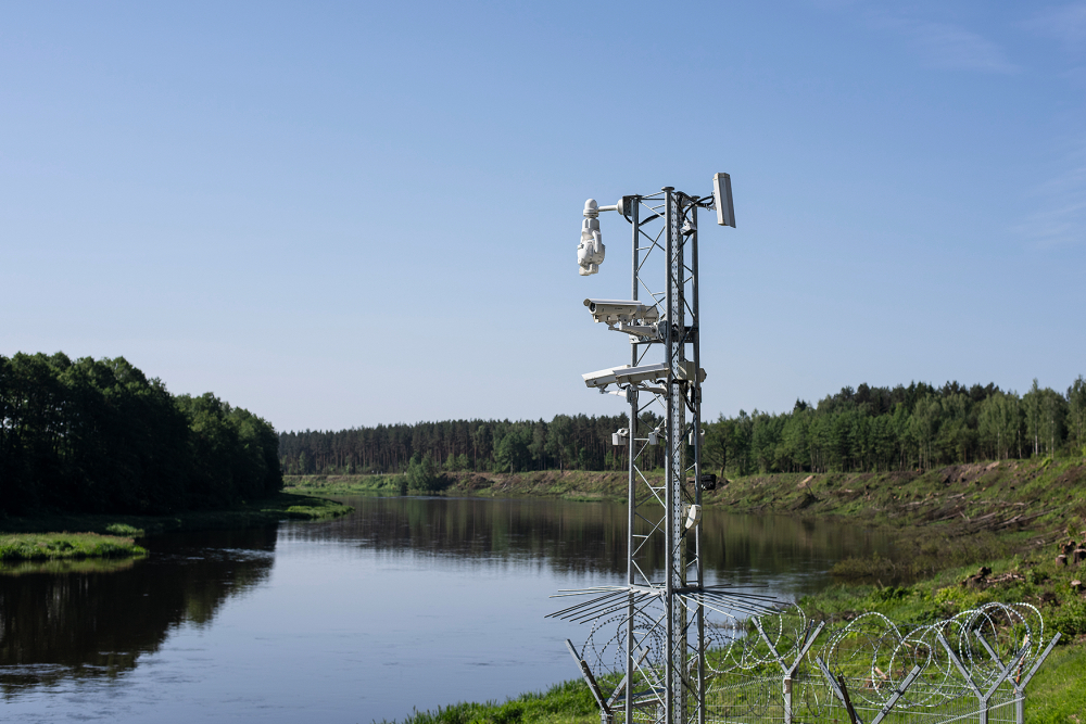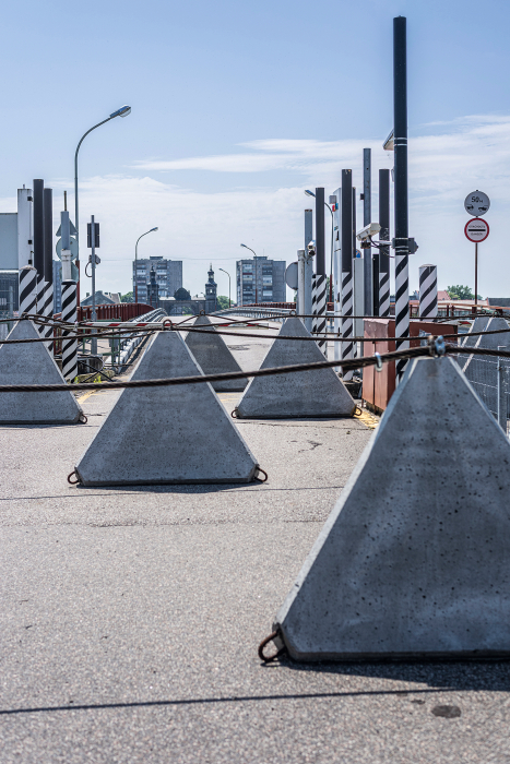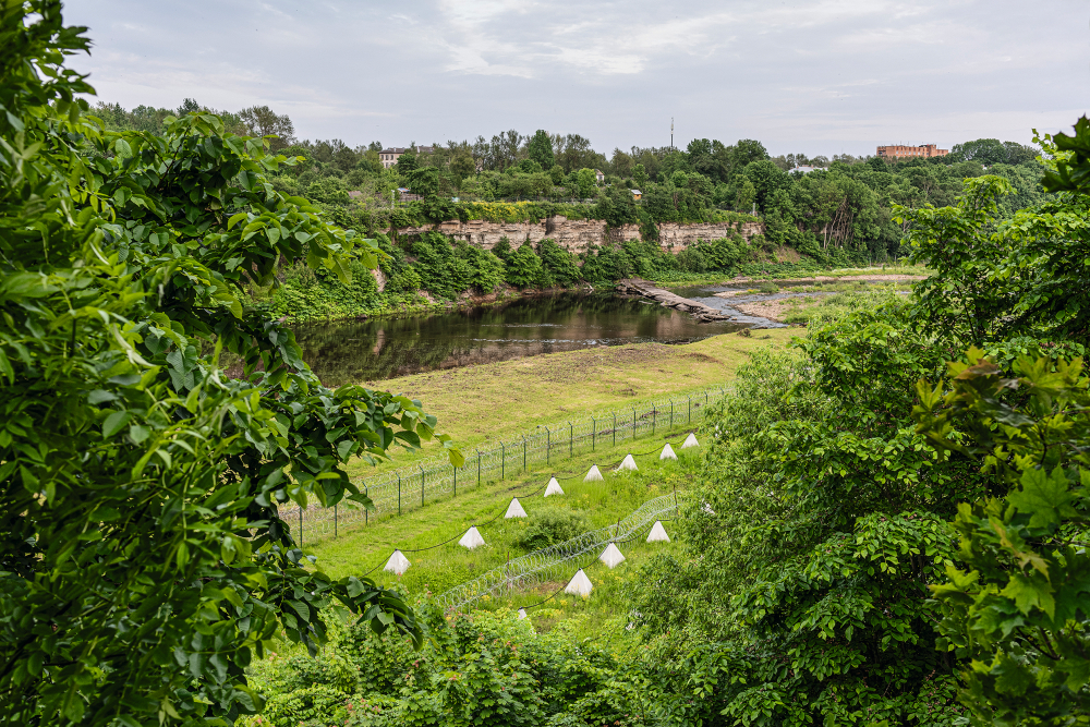 Der Fluss Narva markiert hier die Grenze zwischen Estland und Russland, bevor er nördlich der Stadt in den Finnischen Meerbusen mündet. Kameras, Sensorik, digitale Kontrollen und punktuell gesetzte Panzersperren verdichten ihn zu einem technisch überwachten Grenzraum. Der Übergang in Narva ist inzwischen allein Fußgängern vorbehalten.