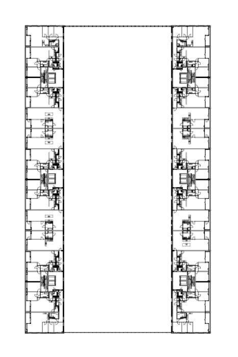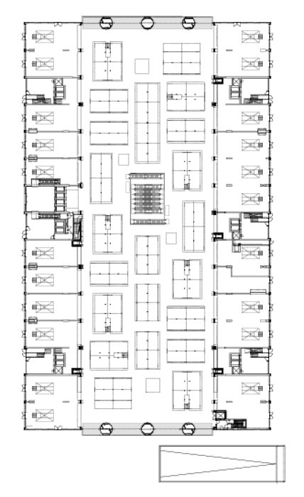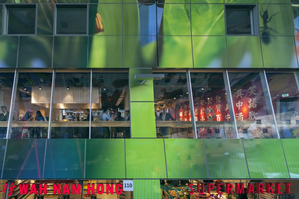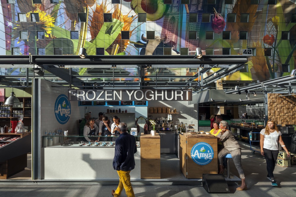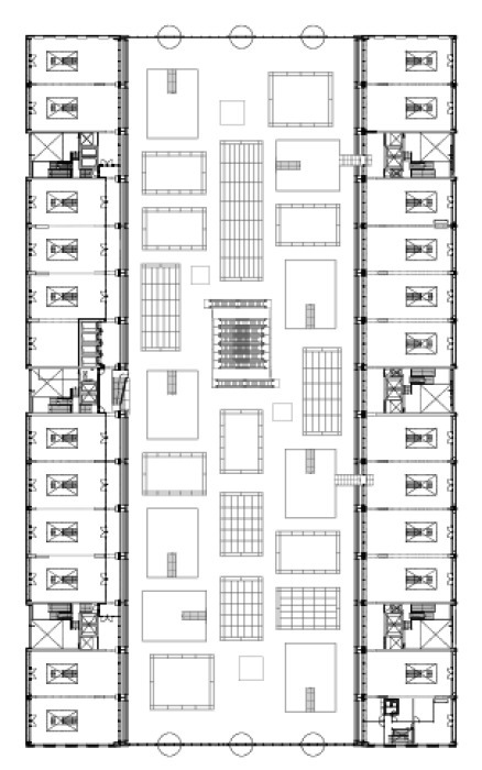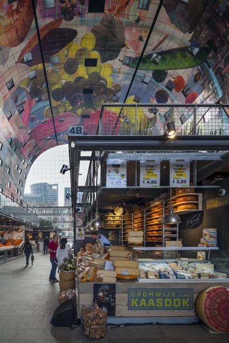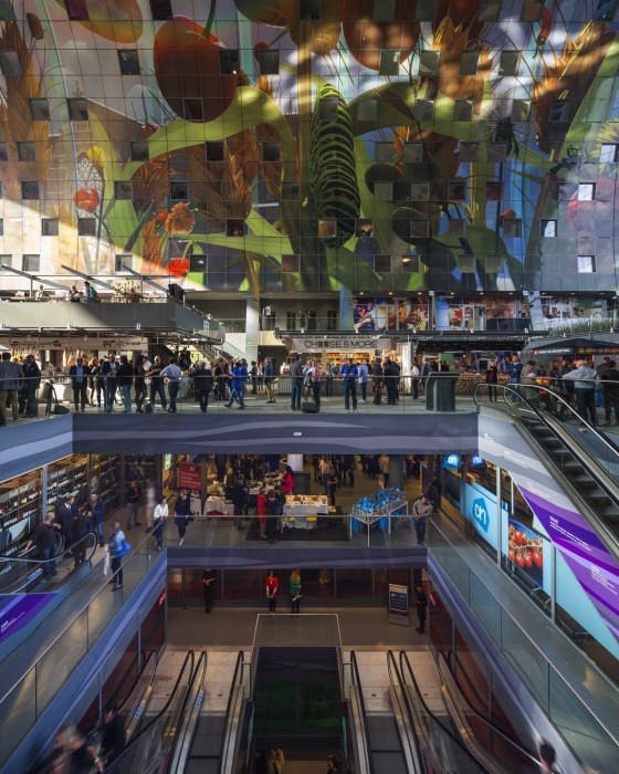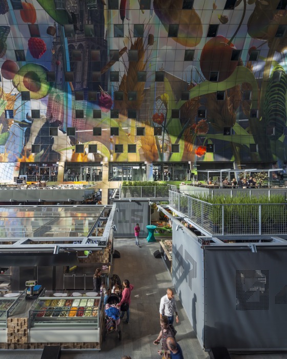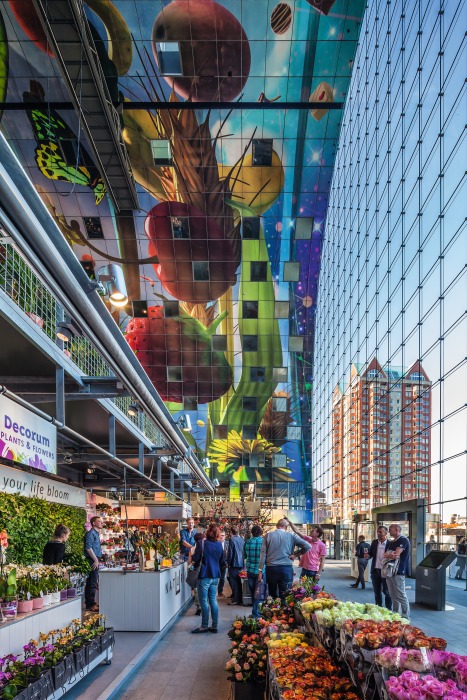 Beiderseits der 96 Marktstände (á 20 m2) sind in Erdgeschoss und 1. Obergeschoss zwanzig Läden und acht Gastronomie-Einheiten untergebracht. Darüber liegen die 228 Wohnungen.