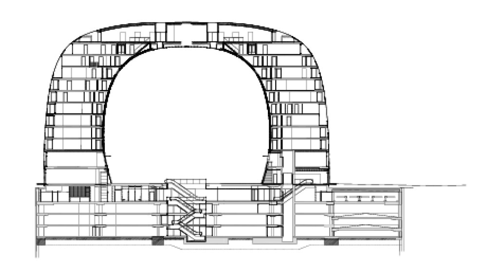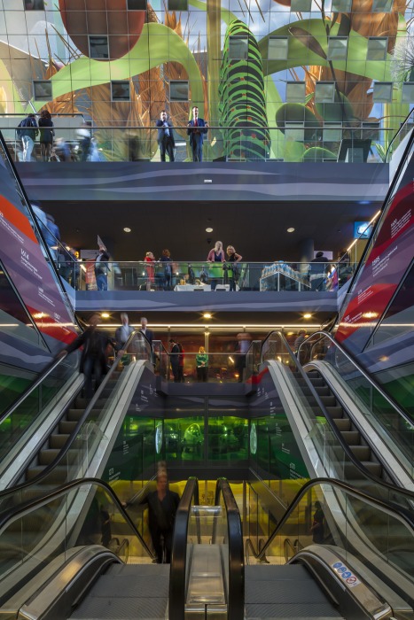Die zentrale Verbindung zu den vier Untergeschossen, in denen sich 1200 Auto-Stellplätze und ein Supermarkt befinden