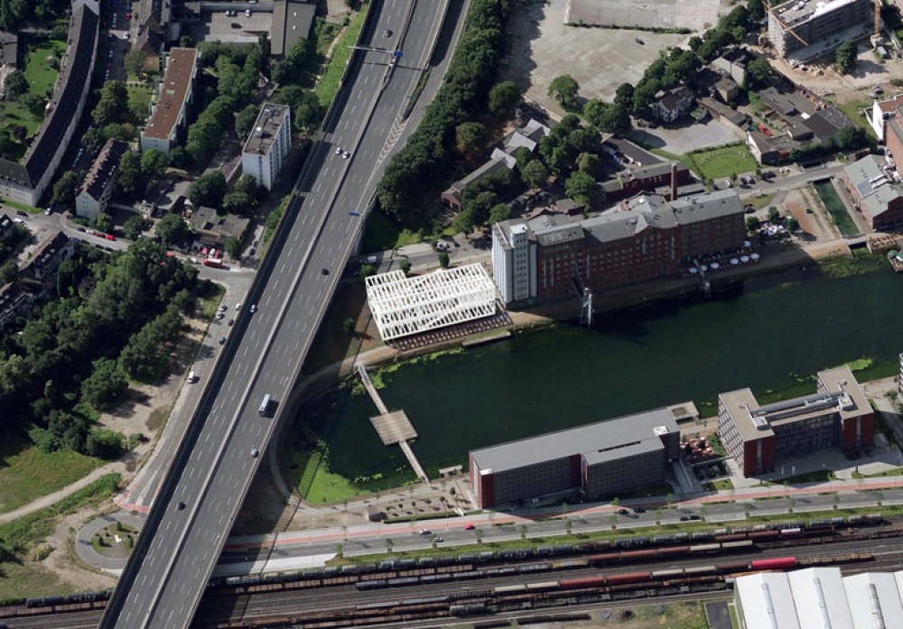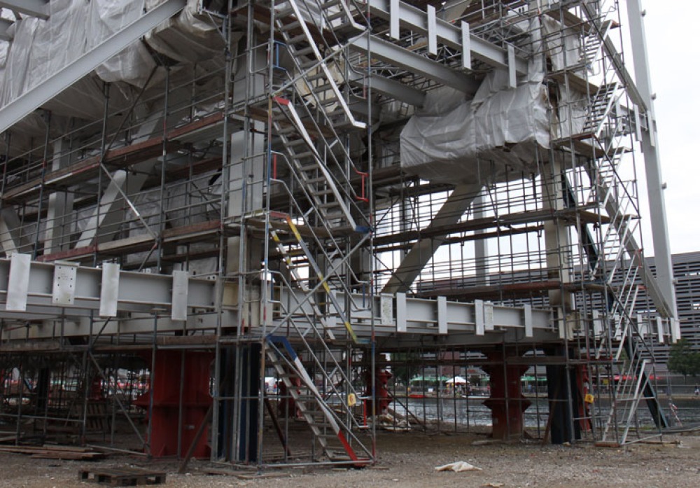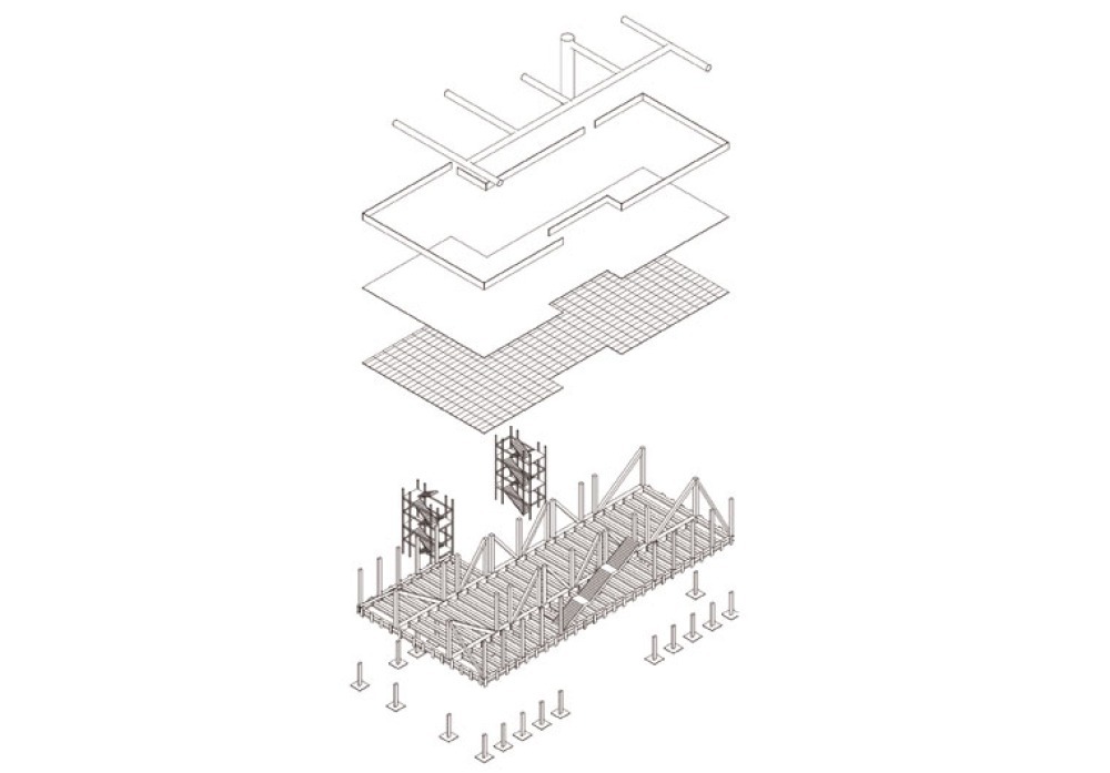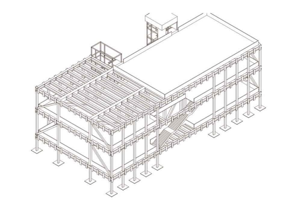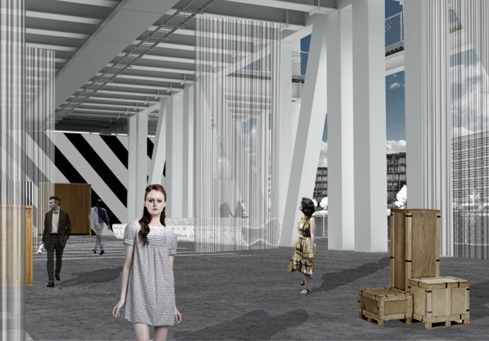 ... schlagen Manten und Schulz eine Nutzung des Stahlskelettes als temporäre Raumstruktur an ihrem derzeitigen Standort vor.