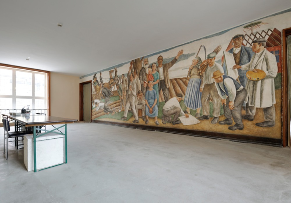 Auch das Wandgemälde "Wendepunkt" von Arno Mohr im Vorraum der Aula ist von der Einhausung befreit.