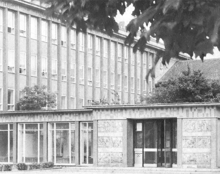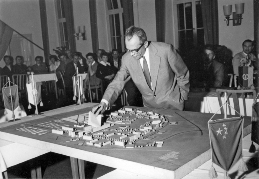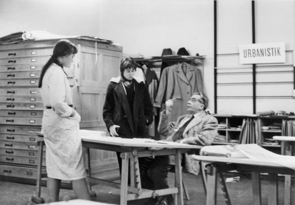 ... der von 1950 bis 1970 auch der Leiter der Architekturabteilung der Kunsthochschule Weißensee war (im Bild 1958 mit den Studentinnen Christiane Miko und Babette Svenson)