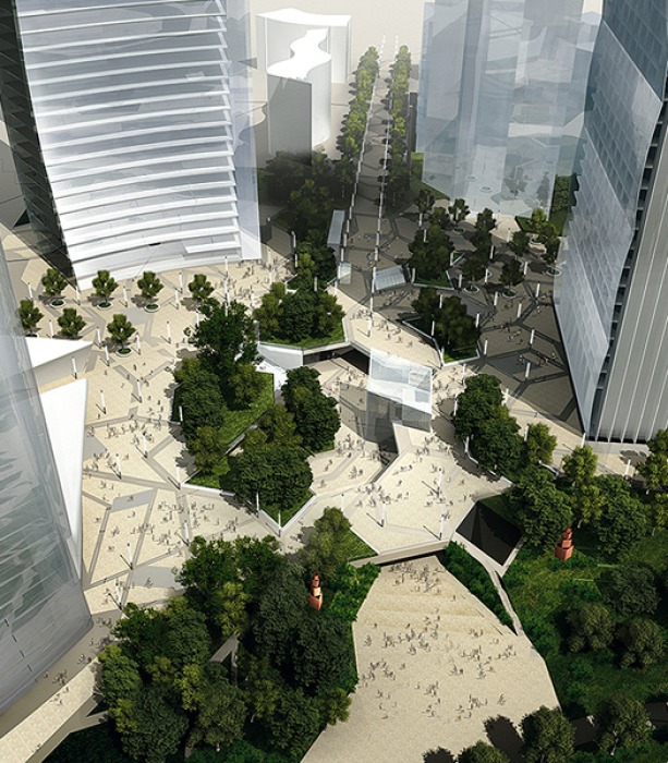 ... der von drei riesigen, ohne Zusammenhang platzierten, Bürotürmen flankiert wird.
