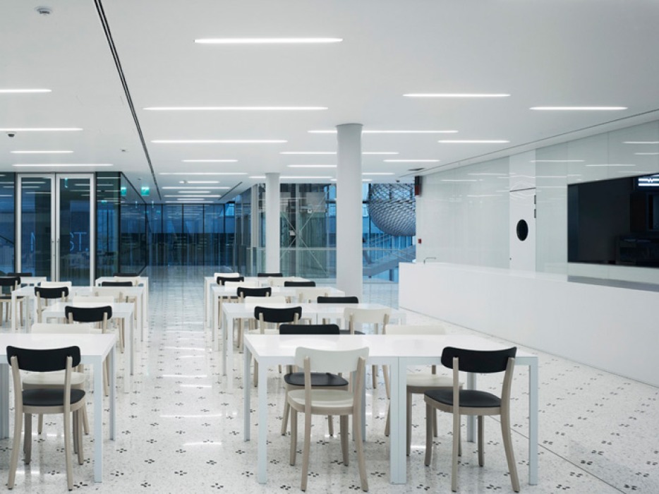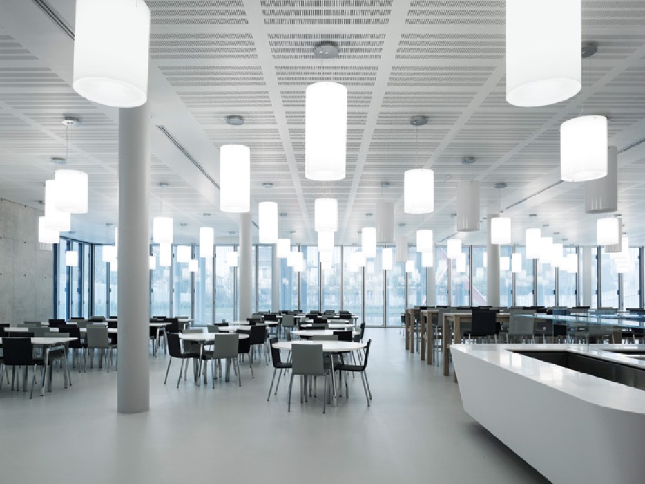 Im Erdgeschoss auf der Rückseite des Gebäudes befindet sich das lichtdurchflutete Firmenrestaurant.