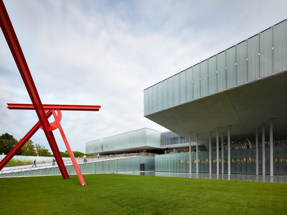 Die öffentlichen Bereiche im Obergeschoss werden über zwei Rampen von der Straße aus erschlossen. Die rote Skulptur "Old Grey Beam" (links) stammt vom US-Künstler Mark di Suvero.
