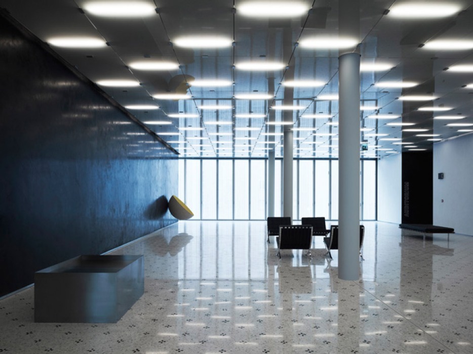Im hellen Foyer des großen Vortragssaals kann man sich auf den Miesschen Barcelona Chairs entspannen oder, seitlich auf gemustertem Terrazzoboden positioniert, ...