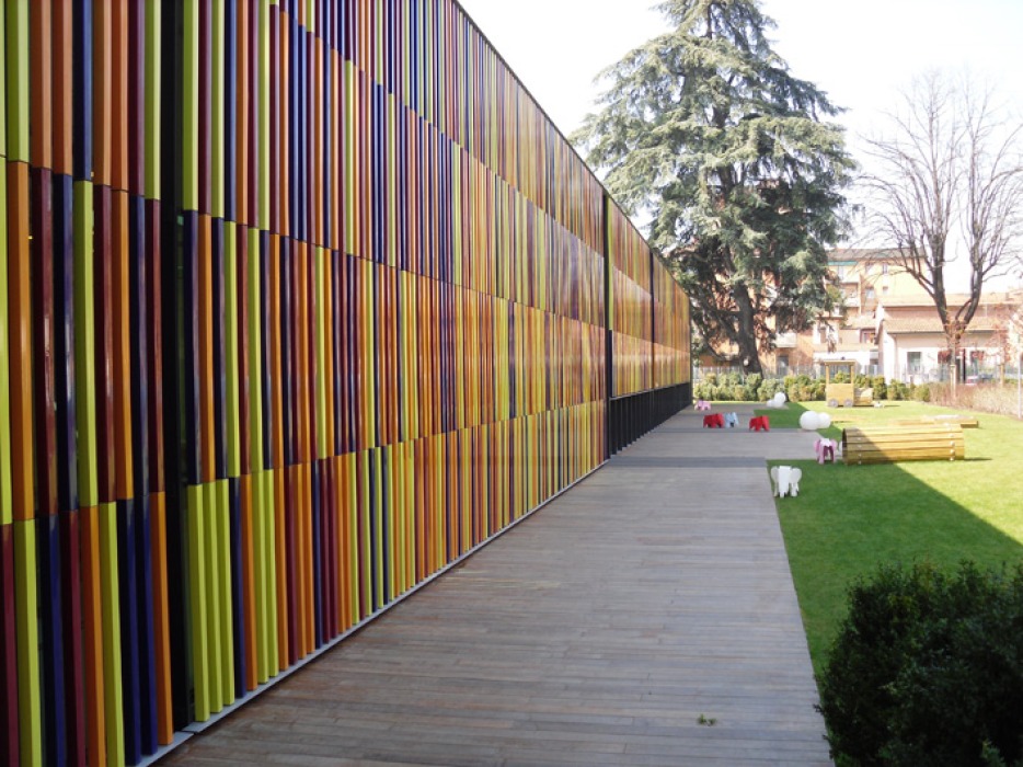 Nur die Nordseite hat anstelle der einheitlichen, neutralen Fassade eine feingliedrige und farbige Stabstruktur erhalten.