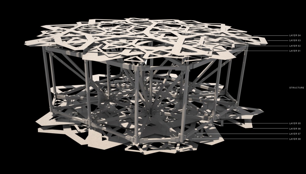 Die Schichten sind in Form von Drei-, Vier- oder Achtecken versetzt übereinander angeordnet ...