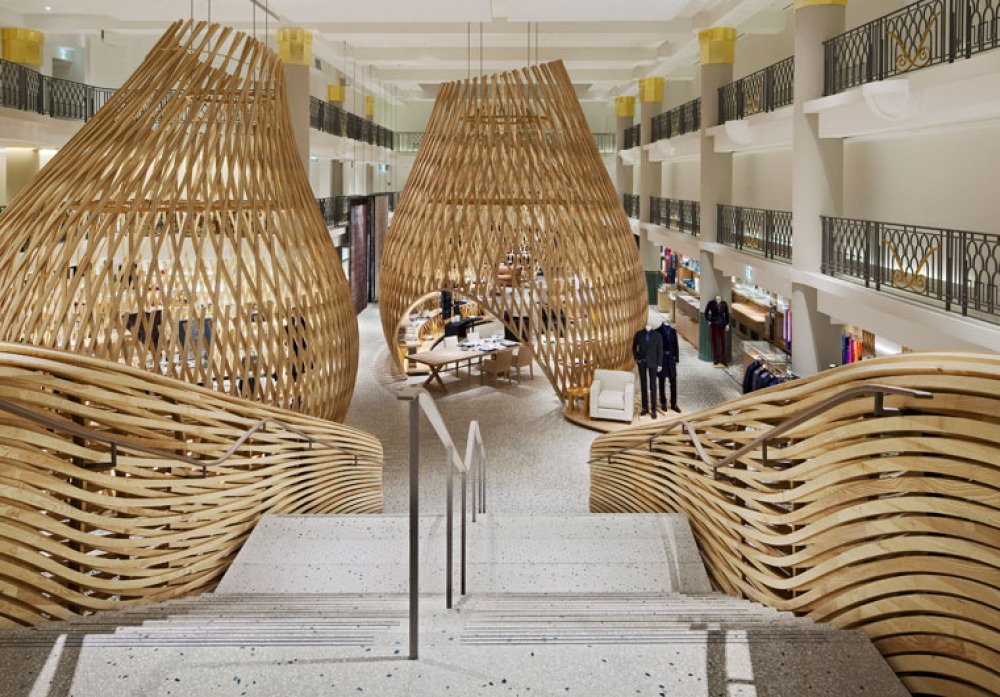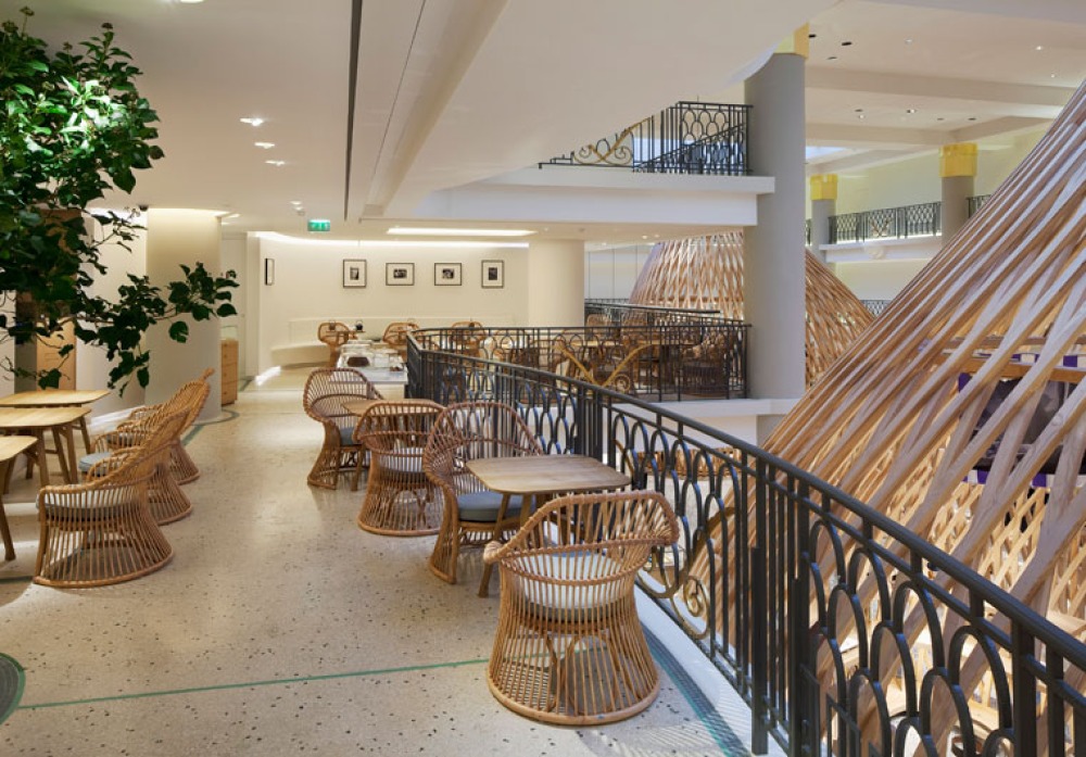 Das Unternehmen edler Luxusgüter entschied sich bei der Ausstattung der Galerie für Korbstühle.