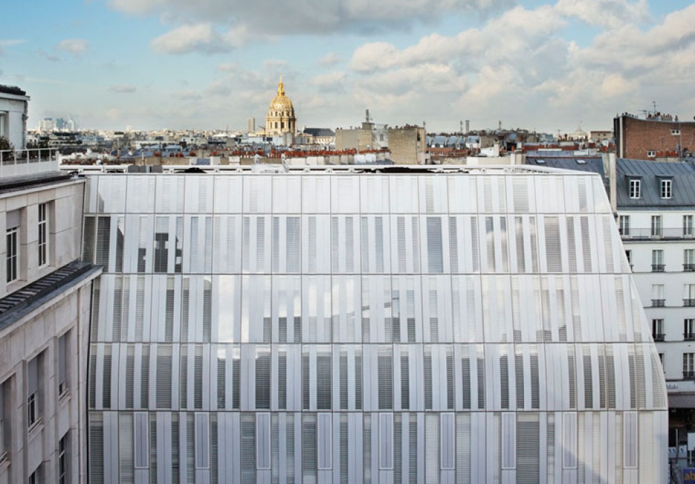 Blick aus der Chefetage der Postbank auf die glatte Fassadenhaut; im Hintergrund der Invalidendom.