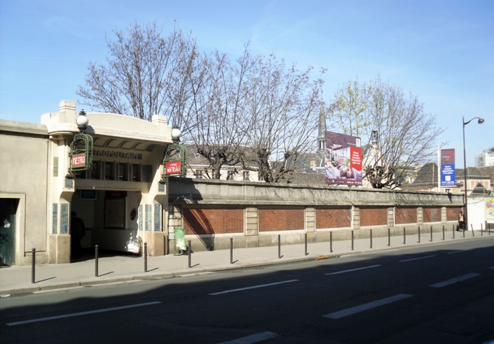 Projekt der Architekten Valode Pistre auf dem Krankenhausareal an der Rue de Sèvres. Im Vordergurnd der Brunnen und die Metrostation.
