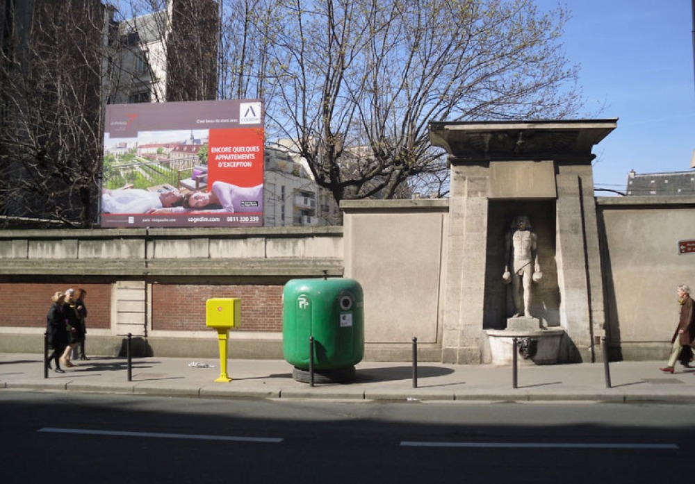 Weiter die Rue de Sèvres: Links der Eingang ins ehemalige Schwimmbad, rechts der Place Le Corbusier und der Square Boucicaut.