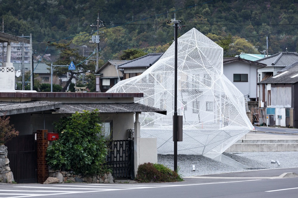 Pavillon von Sou Fujimoto aus weißem Edelstahlgewebe. Er steht seit 2015 auf der Fischerinsel Naoshima bei Takamatsu
